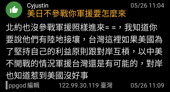 → ppgod : 就是假設美日都不出兵只負責軍援台灣,而台灣的海05/26 10:10