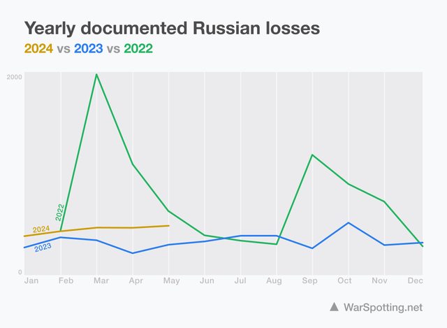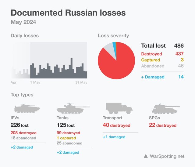 WarSpotting 2024年 5月 俄羅斯裝備損失數量統計