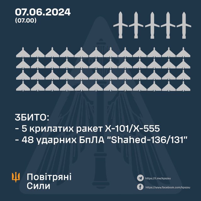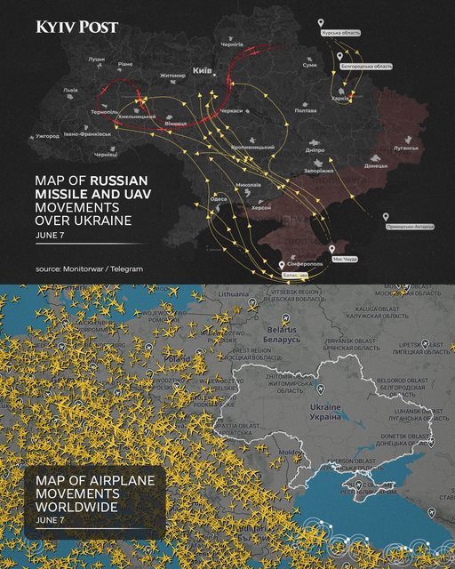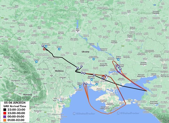 6月 6-7 日夜間襲擊期間導彈和無人機的軌跡
