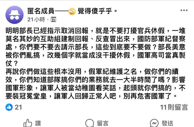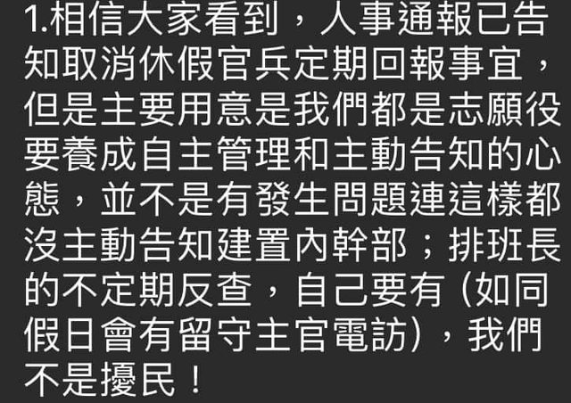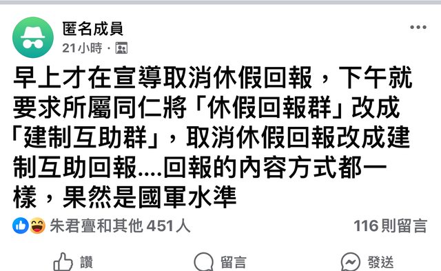 → jobli : 再增訂回(查)報機制,違逆各級長官冀望官兵「安 06/08 19:18