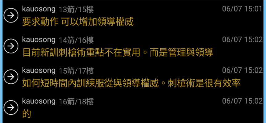噓 dorozo779 : 對了 要跟你講刺槍術之前是不是還得報什麼軍種軍階? 06/09 20:11