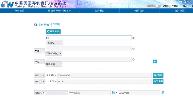 例如輸入FN,就能查到所有以FN為申請人名義,在中華民國申請的專利資料。