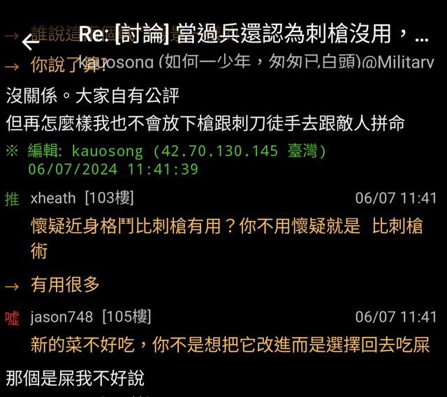 → jay9968 : 「你認為的刺槍術的功效」就是正確的?自打臉? 06/13 01:03