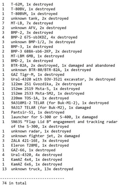 俄羅斯損失包括一架 T-72、工程設備、卡車和