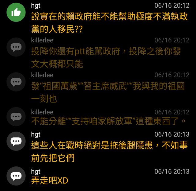 → killerlee : 投降你還有ptt能駡政府,投降之後你發文大概都只能 06/16 20:12
