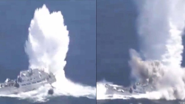影片顯示魚雷在船尾引爆 產生的波浪把船艦舉起來並向前推 雖然沒有讓船艦直接折斷 不過理論上仍然會對船的龍骨造成一定影響 這是什麼船? 這個是074型 https://i.imgur.com/KTO63TZ.jpeg