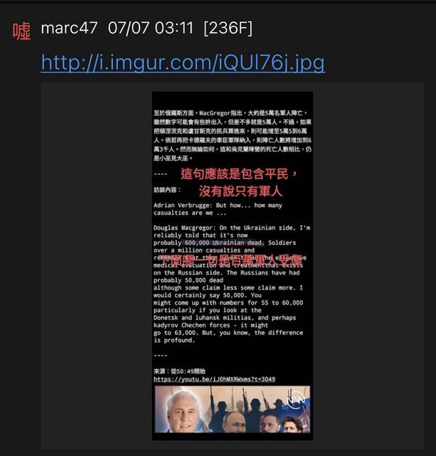 → q2825842 : 軍隊有超過一百萬死傷也蠻唬爛的,這樣烏克蘭防線 07/07 13:06