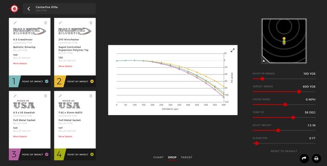 般獵人根本不會開槍的600yd距離,彈道差距也不顯著。這當中彈道最低伸的也不是