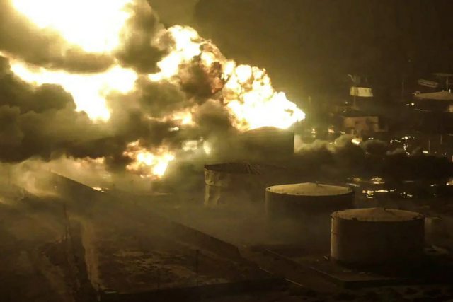 以色列空軍襲擊荷台達港油庫的爆炸鏡頭