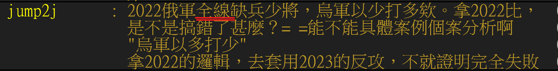 WongKarWai : 他說的是俄軍"全線"缺兵少將 烏軍以多打少 不要幫忙 08/19 17:26
