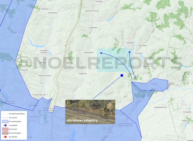 顯示烏軍步兵在基列耶夫卡以南作戰。