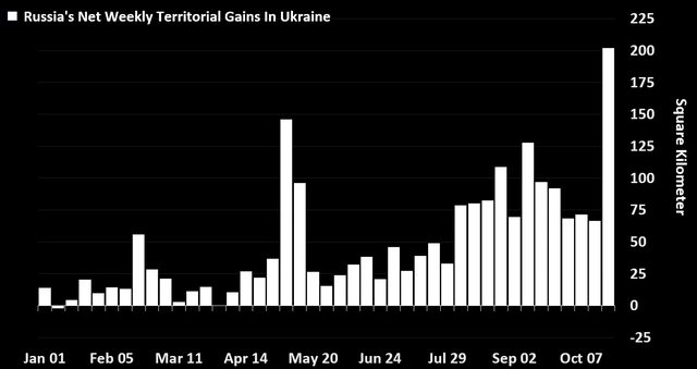 基輔氣氛低落,俄羅斯在烏克蘭加速推進 1.迄今為止,俄羅斯在今年上週取得了 烏克蘭領土最多的進展 2.民調顯示更多烏克蘭人現在支持與俄羅斯 進行和平談判 媒體: Bloomberg 俄羅斯軍隊在烏克蘭東部的推進速度正在 加快,上週奪取的土地比今年任何時候都多 , 基輔面臨越來越大的壓力,因為美國和 歐洲盟友要求加強防禦。 超過200平方公里的收穫,增加了俄軍在一場 艱苦的夏季攻勢中奪取的領土,這場攻勢 導致俄軍和裝備遭受巨大損失。 根據DeepState 地圖記錄的變化進行計算, 自8 月6 日以來,俄羅斯已在烏克蘭佔領了 1,146 平方公里的土地,比今年前7 個月 增加了約四分之一。 https://i.imgur.com/hRSyINB.png