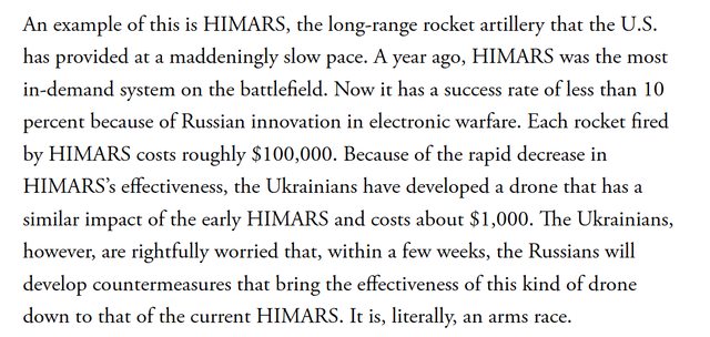 HIMARS就是一個例子,美國以極其緩慢的速度提供遠端火箭。一年前,HIMARS 是戰場上 最受歡迎的系統。現在由於俄羅斯在電子戰方面的創新,它的成功率不到10%。 HIMARS 發射的每枚火箭成本約為 10 萬美元。由於HIMARS的效能迅速下降,烏克蘭人開發了一種 無人機,其效果與早期的HIMARS類似,成本約為1000美元。然而,烏克蘭人有理由擔心, 幾週內俄羅斯人將制定對策,將這種無人機的效能降低到目前的 HIMARS 的水平。從字面 上看,這是一場軍備競賽。 俄軍這破爛的電戰系統也能干擾到只剩10%.... -- ※ 發信站: 批踢踢實業坊(pttsite.org.tw), 來自: 1.168.12.139 (臺灣) ※ 文章網址: https://pttsite.org.tw/Military/M.1730953143.A.E93