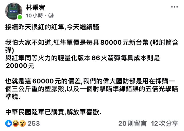 推 saccharomyce: 怎麼不敢說國造66火箭彈的價錢? 11/08 11:08