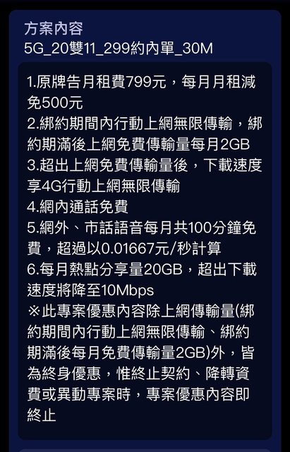 1.當前資費和到期日期:台星2020年雙11方案$299已到期 2.使用需求:4G吃到飽 3.常出沒地區:台中市 4.NP/續約/新辦:中華電銷攜碼499吃到飽 5.預算範圍:500內 6.補充說明: 以下是目前台星的合約 https://i.imgur.com/LUtTRd3.jpg