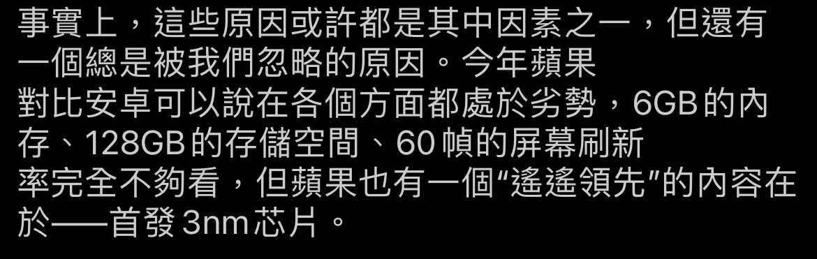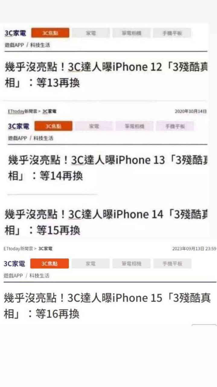 1.原文連結: https://www.163.com/dy/article/IENF5PG90511DG68 2.原文標題: 人人罵,人人買? iPhone 15銷量喜人,今年還能“昨日重現”嗎? 3.原文來源(媒體/作者): 網易新聞 4.原文內容: 人人罵,人人買? iPhone 15銷量喜人,今年還能“昨日重現”嗎? 不出意外,iPhone 15發布後網絡上幾乎是一面倒的負面評價。關於蘋果“擠牙膏”、“ 蘋果輸麻了”、“蘋果不行了”的討論可謂熱火朝天,但與此同時還有一個奇怪的現象: 變化不大,銷量不少。 最新的消息顯示,iPhone在發布後不到24小時的時間內,僅在某東一個平台預定量就已經 達到了222.8萬台。截至發稿前,四款新iPhone機型累計預定量已經接近300萬台,這還僅 僅只是某東這一個平台的預約量,15日某貓平台開啟預售後必然會迎來新的增長,再算上 其他平台以及線下的預約量,可想而知會是怎樣一個數字。 與此同時,“遙遙領先”的Mate 60 Pro在8月29日中午12:08開售到9月1號23點59分59秒 ,在用時差不多的情況下,包括華為商城、某東及深圳線下渠道銷售+預售的首銷量才勉 強達到80萬台。 當然,這樣對比並不公平。一方面Mate 60 Pro至今還沒有開正式的發布會,供應鏈的最 新消息是目前Mate 60 Pro已經加單到了1500萬台-1700萬台,還有一波更強的增長等在後 面。另一方面也有網友質疑蘋果預約數字的真實性,畢竟由於蘋果預定並不需要提前支付 任何定金,所以出現了很多自稱在京東預定了數百台iPhone 15手機的網友,帶來了不少 歡樂。 而真正的問題在於,在目前的消費環境中,消費者對於價格越來越敏感,幾十塊錢的眉筆 尚且要仔細考慮,但為什麼售價最高達到一萬四千塊,但升級卻並不明顯的一款手機,卻 仍然能夠如此火爆? 關於這一現象的原因,每個人或許都有自己的答案,有人說這是因為蘋果的獨特系統,有 人說是來自蘋果用戶的使用習慣,還有人說這是在為蘋果的品牌買單,更有人認為這純粹 是人的攀比心理在作祟。 事實上,這些原因或許都是其中因素之一,但還有一個總是被我們忽略的原因。今年蘋果 對比安卓可以說在各個方面都處於劣勢,6GB的內存、128GB的存儲空間、60幀的屏幕刷新 率完全不夠看,但蘋果也有一個“遙遙領先”的內容在於——首發3nm芯片。 芯片重要嗎?當然,如果不重要,我們不會為國產芯片的發展歡欣鼓舞。那麼3nm芯片重 要嗎?問到這個問題或許我們就會陷入分歧。畢竟無論是3nm還是7nm,我們都是一樣用來 看劇、刷短視頻、打王者榮耀,而這些並不會因為芯片的性能受到太多影響。 換言之,芯片作為一部手機的核心反而但給人的感知確實最低的,而與之相對的外觀、充 電、續航、信號、高刷等反而是最直觀的。從這個角度上來說,無論蘋果的“內褲色”多 配色探索,還是國產手機廠商“卷”參數,快充甚至直衝200W高刷各個144Hz打底,某種 程度上來說都是有針對性的提升。 但事實上,想要了解芯片算力對使用感受及功能帶來的影響,我們看一看智能汽車就能在 一定程度上進行類比。目前應該沒有哪家新能源汽車不宣傳自家汽車“算力即王道”,高 算力帶來更強的信息數據處理能力,連同越來越豐富、越來越發達的各類雷達、攝像頭構 成了智能駕駛、智能感知的硬件基礎,正在不斷拓展著汽車功能的邊界。 更先進製程芯片為大型遊戲渲染、視頻剪輯、圖像處理、AI運算分析等帶來的提升是多方 面的,業界還有評論認為,此次3nm製程為蘋果的芯片帶來了自2020年以來最大的性能和 效率飛躍,而上一次蘋果實現製程工藝的飛躍還是在2020年的A14和M1芯片,而這或許會 成為一個新的起點。 當然,目前來看相關軟件目前來看仍然是落後於芯片硬件的,是否要花費上萬為一個還不 太確定的未來買單,這筆買賣是否划算目前可能還不好斷言,最終的結果以及用戶的實際 反饋還要“讓子彈飛一會”。 尤其9月25日還有華為正式的秋季新品發布會,不少人仍然抱著持幣觀望的態度,或許真 正的“決戰”還沒有開始…… 你覺得這場“戰鬥”誰會獲勝呢? 5.心得/評論: 網上粉紅拼命罵, 結果現實China銷量, 蘋果新機單一平台賣一天就把華為至今的全部銷售量壓在地上打. 話說這篇文章在China也太不政治正確了吧, 不知道可以活多久? -- ※ 發信站: 批踢踢實業坊(pttsite.org.tw), 來自: 1.171.76.194 (臺灣) ※ 文章網址: https://pttsite.org.tw/MobileComm/M.1694879530.A.1E6