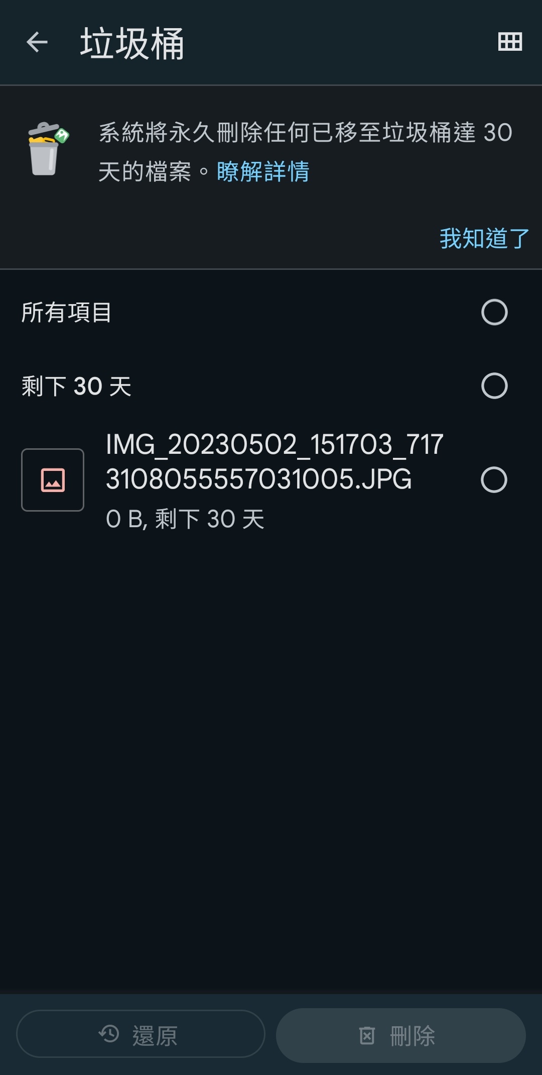 keigowei : 用Google Files移到垃圾桶再刪除試試看10/12 17:54