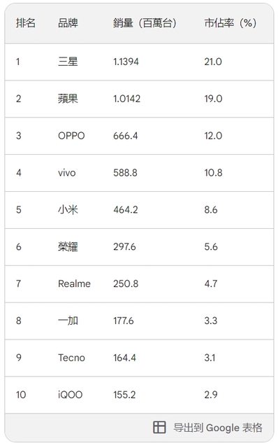※ 引述 《gaiaesque (一起來聽techno八 o'_'o)》 之銘言: :   :   :   :   : 5.心得/評論:內容須超過繁體中文30字(不含標點符號)。 :   : 看左岸的評測頻道 : 之前還很多在吹OV米華 :   : 然後都會間接貶三星不重視中國市場 : 畢竟硬體部分拚不過左岸手機 :   : 但是人家名氣跟軟體贏妳很多啊 :   : 光看看google... : 軟體強 硬體輸你個二三年都沒差 因為看到這是用單一機型來霸榜的排行,所以好奇共機現在到底賣得如何, 畢竟限縮條件然後搞標題殺人是記者的一貫手法。 如果用整體手機品牌的市佔銷量來做排行的話, 目前全球手機品牌最新統計的銷量是這樣:(資料來源-Google Bard參考TechInsights的數 據) https://i.imgur.com/7UxF6rg.jpg