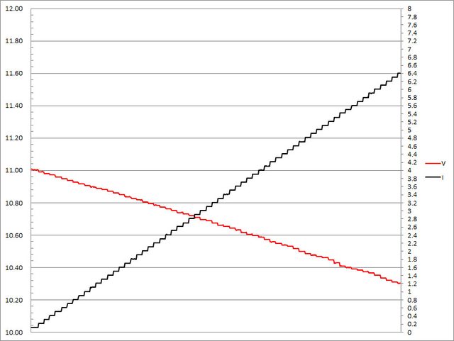 輸出電壓下降,輸出電流超過6.4A壓降,超過6.5A截止