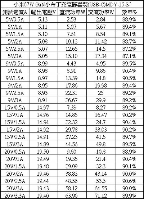 ▼110V輸入下各組輸出轉換效率表,整體輸出轉換效率在87.1%至90.6%之間