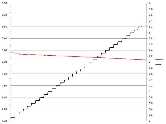 ▼固定檔5V輸出負載測試,隨著電流增加,輸出電壓下降,輸出電流超過3.3A截止