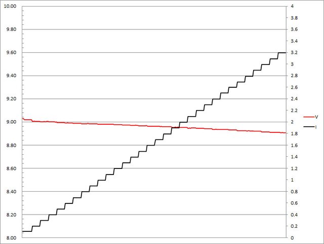 ▼固定檔9V輸出負載測試,隨著電流增加,輸出電壓下降,輸出電流超過3.2A截止