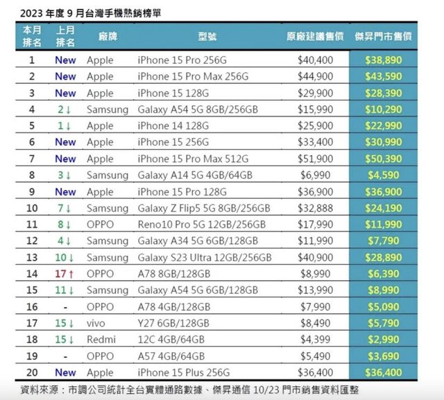 2023年9月台灣手機市場銷售排行揭曉,蘋果在9月中正式推出iPhone 15年度智慧手機新