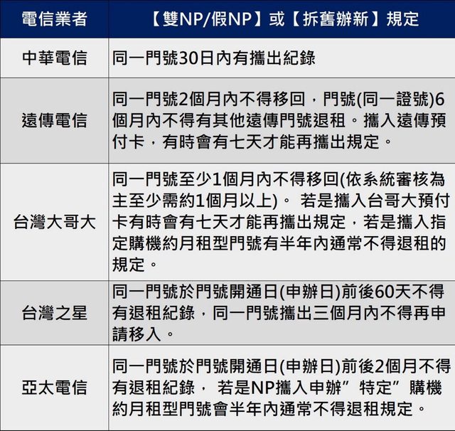 https://www.kocpc.com.tw/archives/517095 2023年10月24日文 因為只有單篇文章,找不到佐證新聞 所以放在情報分類 內文節錄: 自今年11月起,所有電信業者都將取消 【雙攜碼/假攜碼】件的寬限值。 因應新規定,通訊行自今年10月起已陸續對外停止 提供協助【雙攜碼/假攜碼】服務或是針對可疑的 預付卡攜碼申請件主動加以婉拒受理,此並非店家 故意刁難。換言之,自11月起,若經電信業者判定 該攜碼門號為故意【雙攜碼/假攜碼】行為,通訊行 將會向故意操作的用戶追回攜碼補貼,以避免損失。 https://i.imgur.com/Huwlnuy.jpg