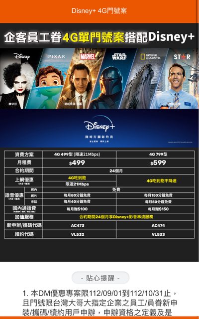 剛辦完台哥大 企業客戶599不限速吃到飽方案 綁約24個月 約期內 1. Disney+ 24個月免費看 2. 4G不限速吃到飽 3. 網內免費,網外150分/月,市話50分/月 4. 通話費加贈 150元/月(簡訊,網外,市話) 合約11月初將到期,比價比了1個月 最終覺得企客599最讚,原本就有看D+ Disney+找3人分攤,2年收4920元 2年月租599x24=14376元 14376-4920=9456元 平均一個月394元 4G不降速吃到飽+Disney CP值不錯啊XD 方案到10/31而已 攜碼/新申辦/續約 都可辦 要雙證件+員工證(或有公司統編的個人名片) https://i.imgur.com/yLG7JQc.jpg