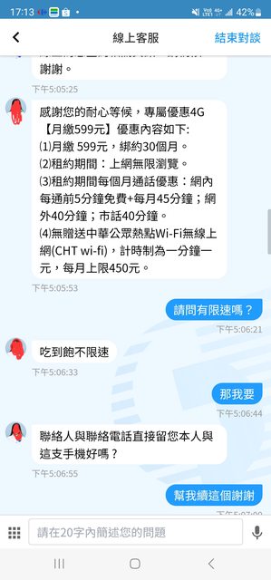 廢話不多說 跟前一篇一樣 每天打電話跟線上客服盧 一開始只會給你官方資費699吃到飽 盧後來客服就要你等候消息 隔天再打電話去盧 登 登 !!! 599舒服到飽 我真的受夠21M了 http://i.imgur.com/kguGwhd.jpg