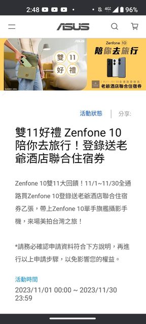 推 minahuang21 : ZF10上市以來都沒降價多少 但送老爺住宿券很有誠意11/08 12:29