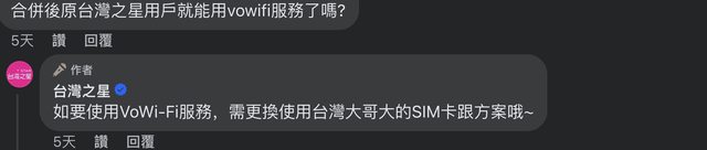 → aalittle : 不過如果是原先台星sim卡就無法用vowifi的硬體限制 11/14 17:29