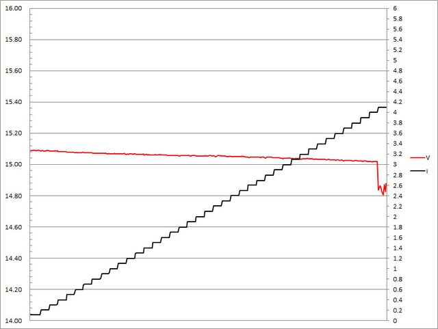 ▼USB-C1搭配5A線材的固定檔15V輸出負載測試,隨著電流增加,輸出電壓下降,輸出電