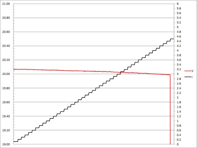 ▼USB-C1搭配5A線材的固定檔20V輸出負載測試,隨著電流增加,輸出電壓下降,輸出電