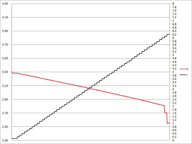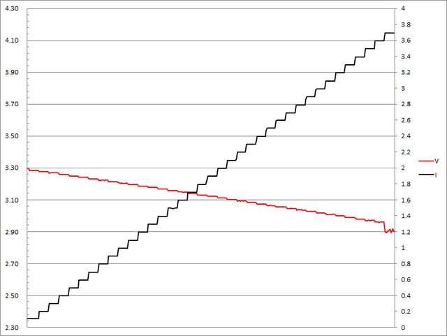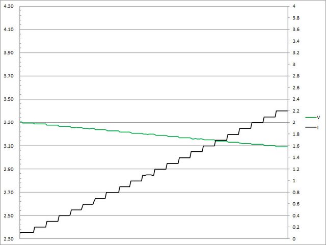 ▼USB-C2的第一組PPS檔3.3V輸出負載測試,隨著電流增加,輸出電壓下降,輸出電流超