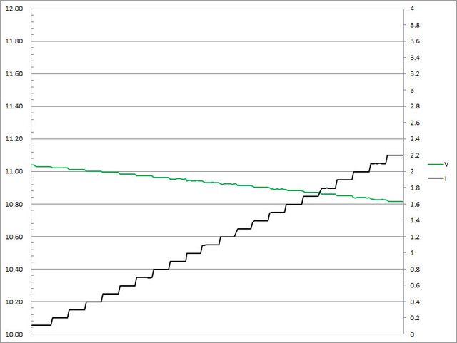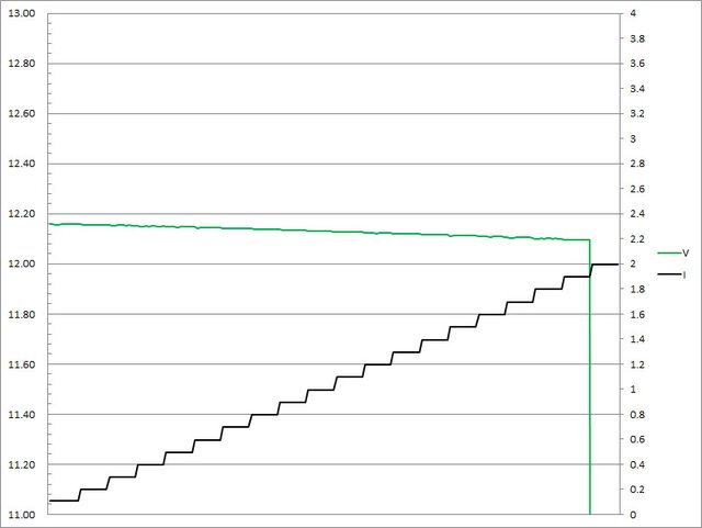 ▼USB-C2的固定檔12V輸出負載測試,隨著電流增加,輸出電壓下降,輸出電流超過1.9A