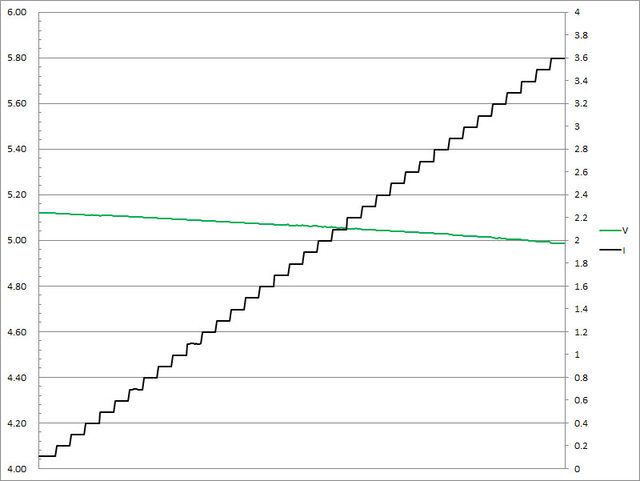 ▼USB-C2的固定檔5V輸出負載測試,隨著電流增加,輸出電壓下降,輸出電流超過3.6A截