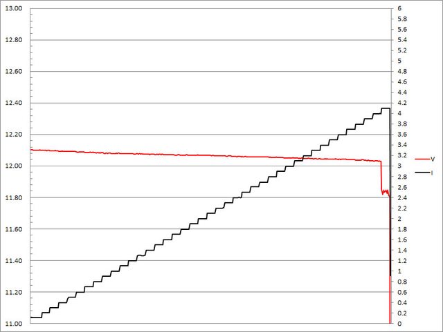▼USB-C1搭配5A線材的固定檔12V輸出負載測試,隨著電流增加,輸出電壓下降,輸出電