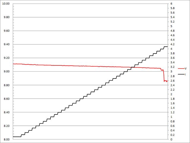 ▼USB-C1搭配5A線材的固定檔9V輸出負載測試,隨著電流增加,輸出電壓下降,輸出電流