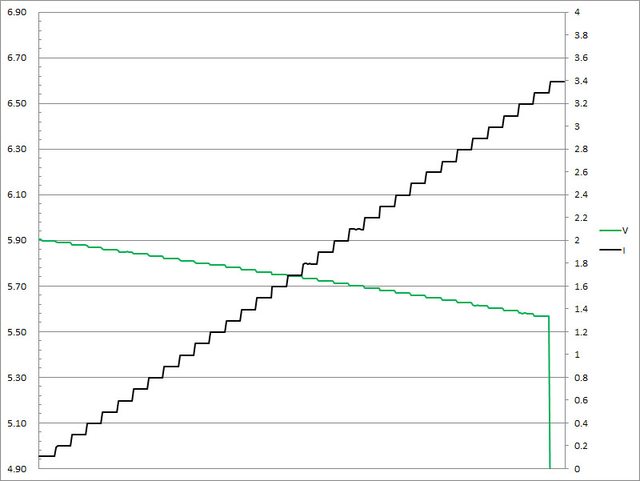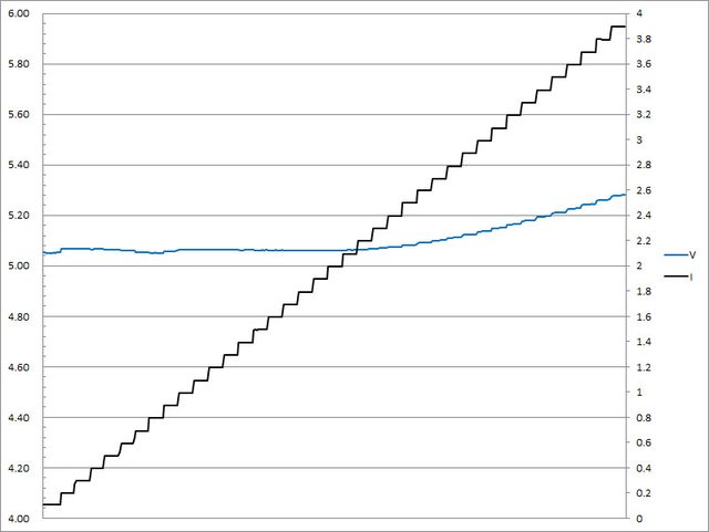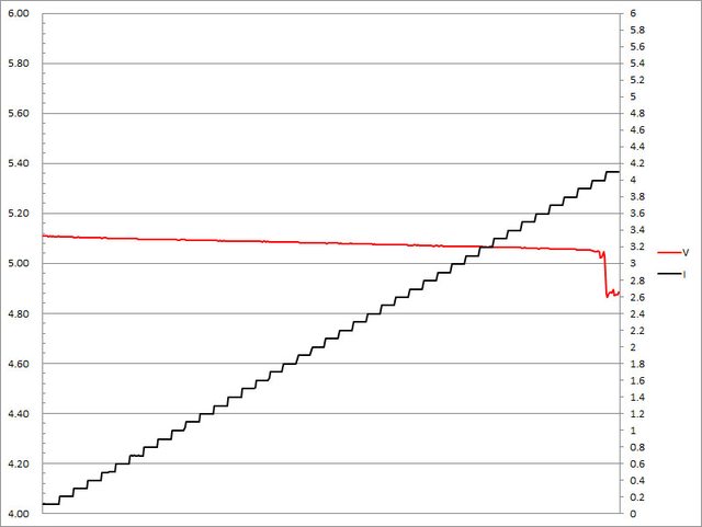 ▼USB-A的5V輸出負載測試,隨著電流增加,輸出電壓上升,輸出電流超過3.9A截止