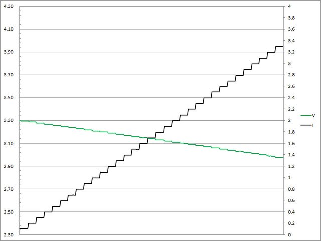 ▼USB-C1搭配3A線材的PPS檔3.3V輸出負載測試,隨著電流增加,輸出電壓下降,輸出電