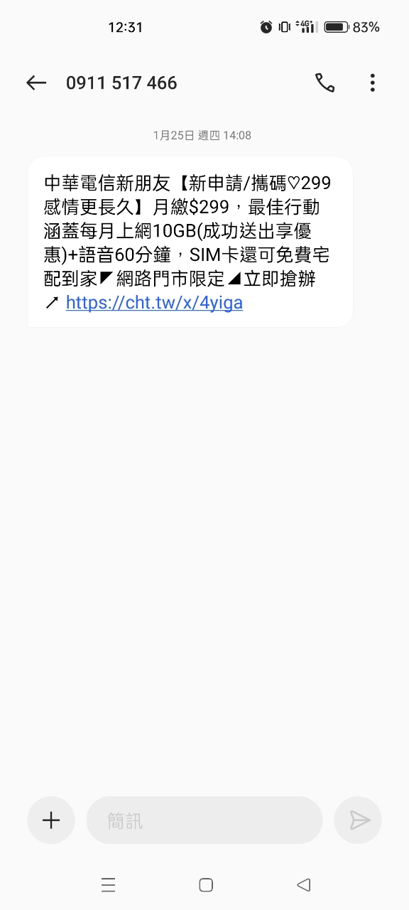 推 Chia2323 : 應該不是詐騙啦我也有收到這簡訊,非網路吃到飽就吸 01/27 12:31