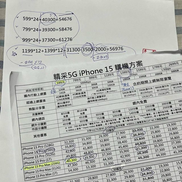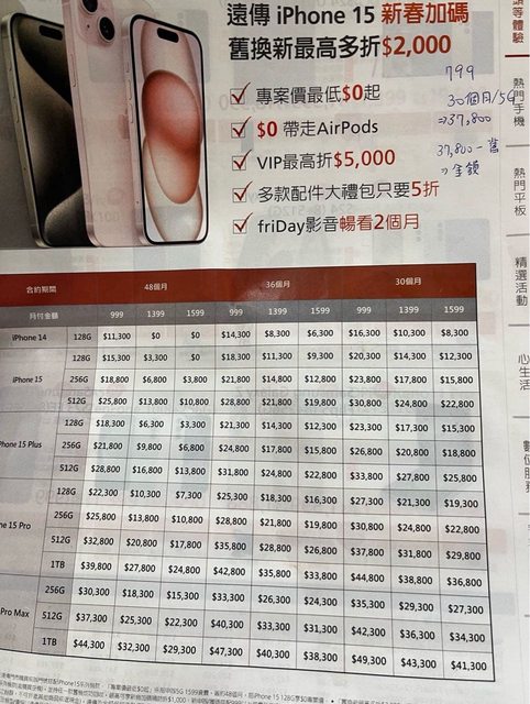 以舊機換新機折抵後iPhone 15 PM價錢是$36740