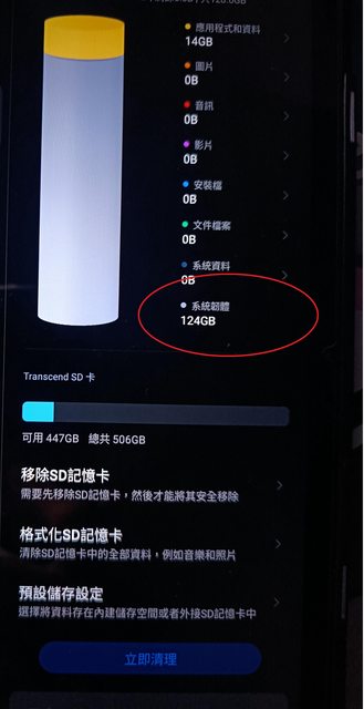 但是對儲存空間再點進去 卻變成系統韌體佔了124GB的情況