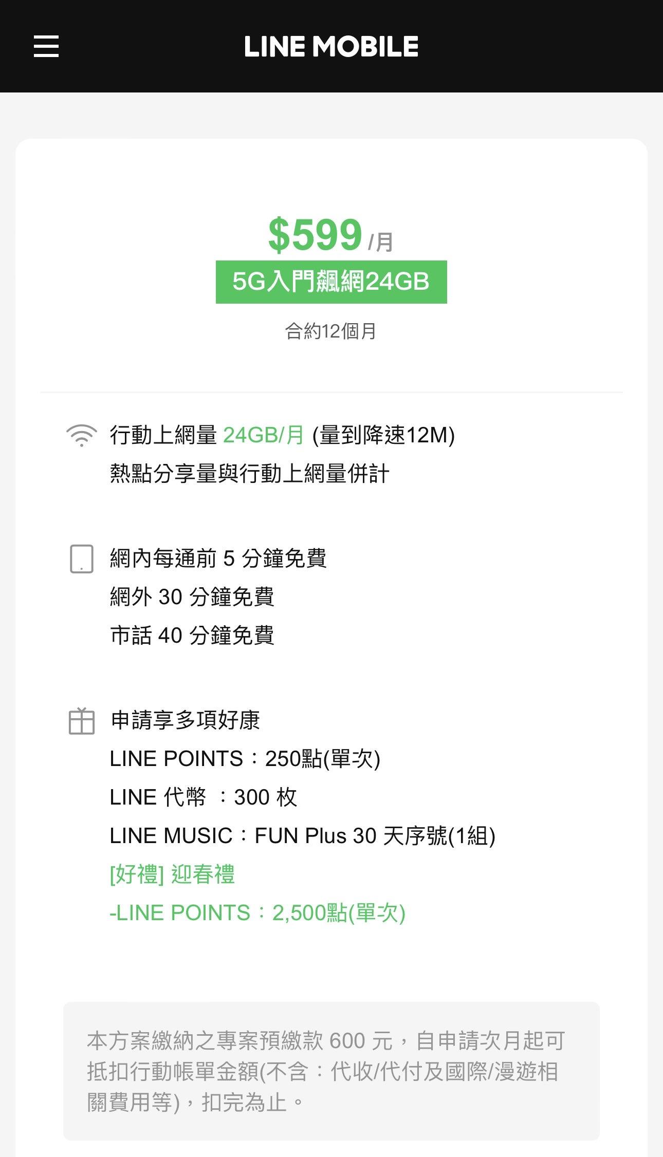 推 mark72 : LINE MOBILE 5G $599目前送2750點,綁約12個月,換 03/03 00:34
