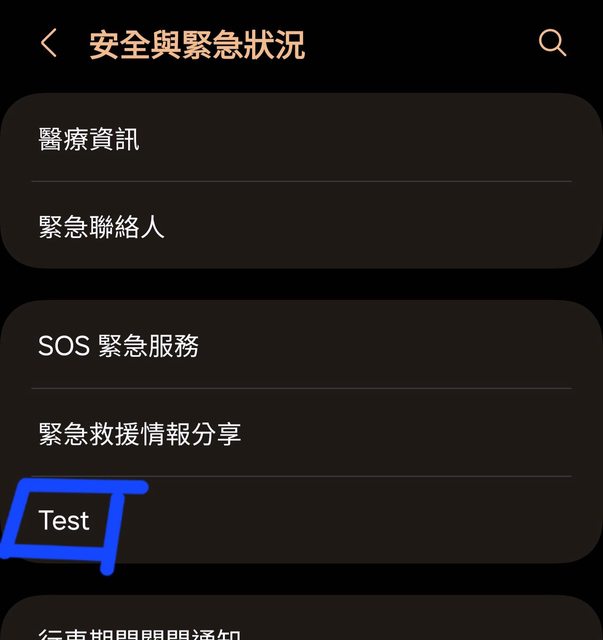 如題,今天在看警報訊息時,發現 安全與緊急狀況 選項裡有個 test 按鈕。按了沒反應
