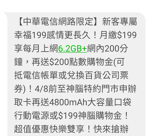 這幾天剛好想幫家裡面小孩辦一個中華新門號 以為199送6.2g這個方案還可以辦理 結果上去中華電信網路門市一直找都只剩下3.2g的方案 問了電話客服才知道到4/8而已 但是我剛好在emome上面挑了一個不錯的0元門號(裡面有4個8、3個9、2個0、0個4) 所以就算沒有6.2g方案也要辦下來 結果我在中華電信的網路門市一直亂點 被我莫名找到在某個裡面還藏著6.2g的連結 就在這邊分享給有需要的人 https://tinyurl.com/CHT199-6gb https://i.imgur.com/wlWm5p2.jpeg