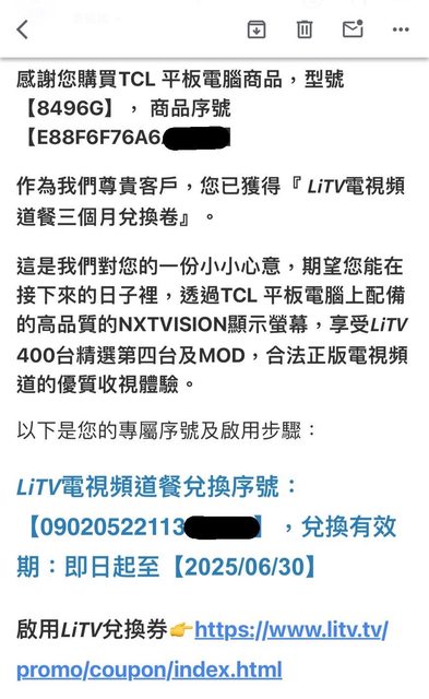 盒外有贈送LiTV電視頻道餐的二維碼,掃完進到序號發放網頁,輸入平板序號就順利拿到開通序號