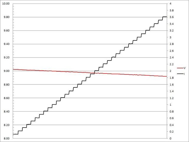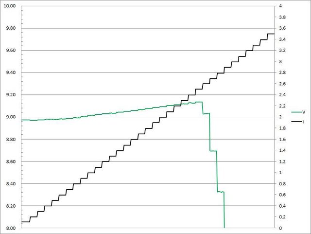 ▼USB-A的9V輸出負載測試,隨著電流增加,輸出電壓上升,輸出電流超過2.5A大幅壓降