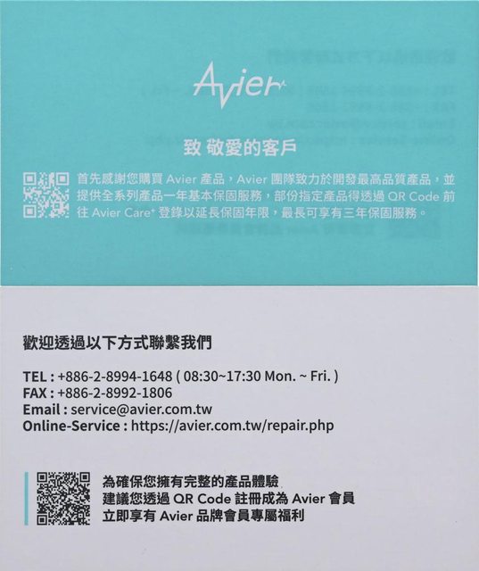 訊、Avier CARE保固說明、生產批次/日期、QR碼、注意事項、BSMI認證標誌
